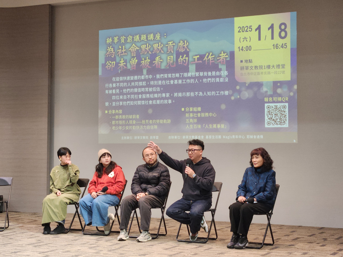 今年(2025)1月18日,由耕莘文教基金會與窮學盟(向貧窮者學習行動聯盟),聯合在耕莘文教院的大禮堂內舉辦的「耕莘貧窮議題講座」,邀請新事社會服務中心、五角伴和人生百味等公益團體,為不同勞工服務領域的社會工作者們,與民眾分享底層勞工不同的勞動生態與貧窮樣貌。