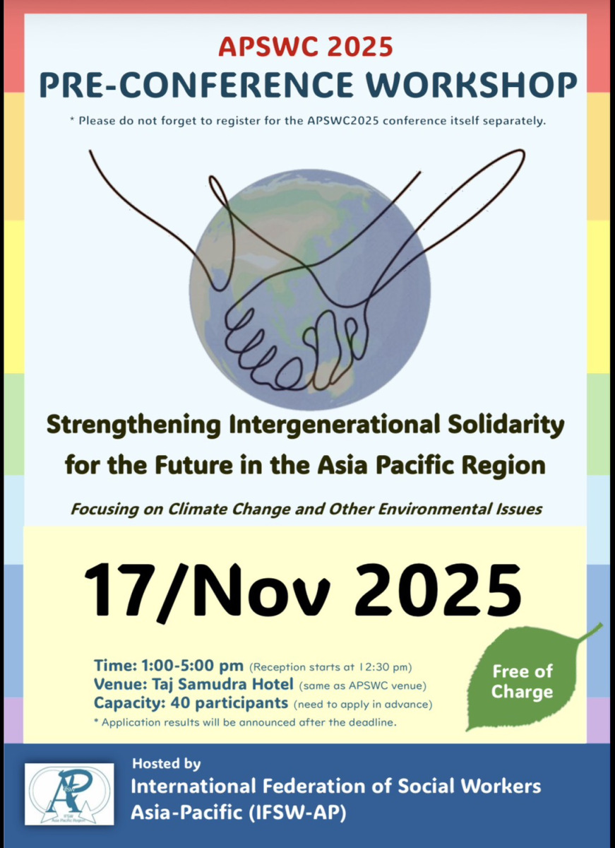 在研討會前一天,大會特別舉辦 「強化亞太地區世代團結,邁向未來」會前工作坊,邀請來自 台灣、柬埔寨、斯里蘭卡及澳洲的講者,分享各國在 氣候變遷與環境議題下的社會工作實踐經驗。工作坊於 2025年11月17日下午1點至5點在 科倫坡 Taj Samudra 飯店舉行。