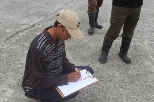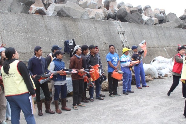海風夾著鹹味迎面吹來,漁工們縮著肩、拉緊外套,但臉上卻滿是興奮。活動一開始,他們依序上前領取禮物,每接過一份禮物,便露出靦腆的笑容。有些漁工甚至開始與志工聊天,其中一位還主動教志工說印尼語——像是「不用客氣(sama-sama)」以及讓大家忍不住大笑的「你好帥(kamu ganteng)」。志工們跟著學、跟著念,現場因此多了幾分歡笑與互動的活力。