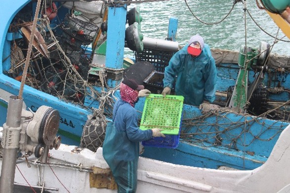 就在這時,港內剛好有一艘漁船返航,船上滿載著剛捕回的螃蟹。漁工們迅速展開下貨作業,一簍簍的新鮮螃蟹被從船上接力搬運到岸邊,船主則在旁邊熟練地進行分類、分級,接著再交由貨車載走。這些螃蟹早已被包船訂購,需要儘速送往市場販售。志工們第一次近距離看見漁工的作業流程,覺得新鮮又驚奇,紛紛拿起手機圍觀拍照,為辛勤的海上工作留下珍貴的畫面。