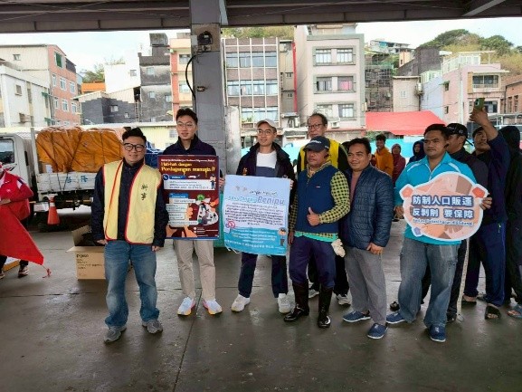 第一站來到基隆市的正濱漁港。活動團隊抵達時,外籍漁工們已整齊排隊等待活動開始,現場氣氛在寒風中依然熱絡。活動開始前,基隆市警察局與社會處先為漁工們進行宣導,內容包含工作與生活相關法規、申訴制度以及反詐騙資訊,協助外籍漁工在異鄉能以更充足的資訊保障自己的權益。