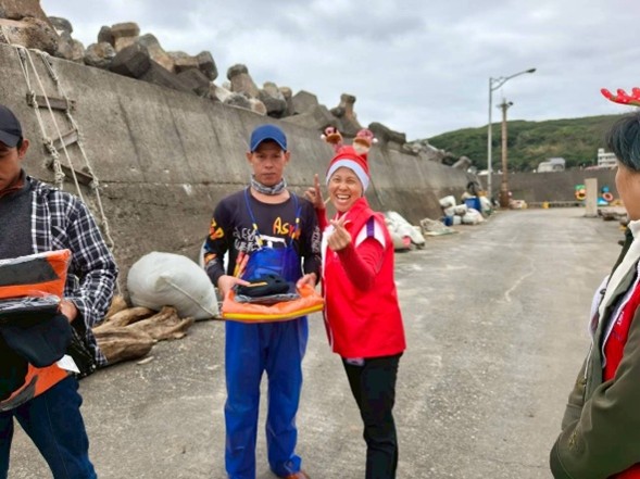 今日的隊伍由徐森義神父與鍾佳伶執行長帶隊,結合新事同仁、萬海志工團隊及其他志工,共 23 位工作人員一同出動,代表社會大眾將感恩的禦寒禮物送至正濱、八斗子、長潭里、深澳、南雅、鼻頭、龍洞、澳底、馬岡共 9 個漁港的外籍漁工手中。