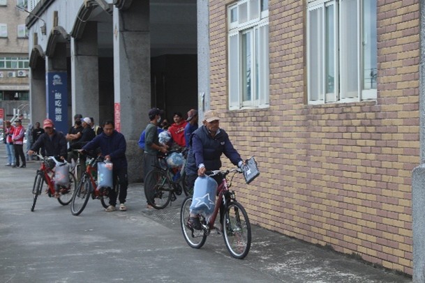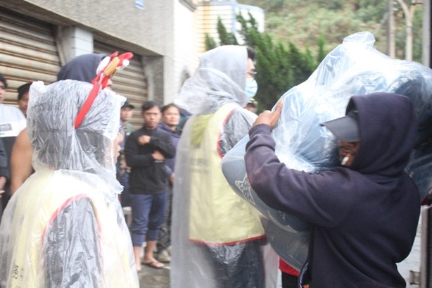▲澳底漁港有許多外籍漁工為了不錯過保暖物資的發放,從遠處騎腳踏車到發放點。