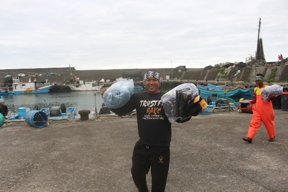 因磺港漁港的漁船停靠在港口兩側,距離較遠,部分漁工因作業不便無法前往主要排隊區域。為了讓每份禮物都能確實送到每一位漁工手中,活動團隊特地開車繞往另一側逐一發放,讓沒能走過來的漁工也能收到物資,確保沒有任何人被遺漏。