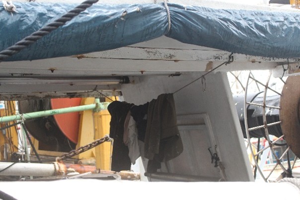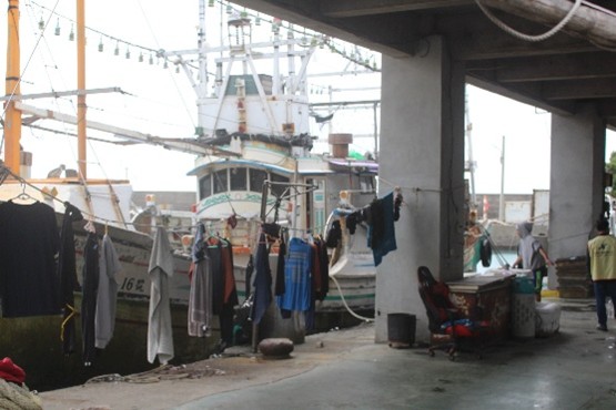 ▲深入龜吼漁港,看到了外籍漁工的生活環境,即便寒冬也只能將衣服晾在漁船上。