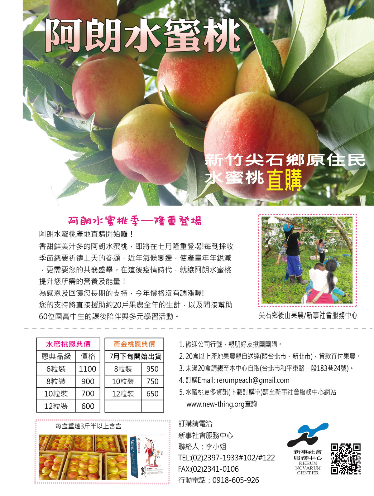 新事社會服務中心推動【新竹縣尖石鄉原住民的阿朗水蜜桃直購活動】已近20年,口碑優良,每年都受到許多民眾的愛戴,每一顆阿朗水蜜桃都有「新事農戶責任標籤」,售後與甜度保障;本著關懷原住民族群的理念,與新竹尖石鄉20戶原民果農攜手合作,「產地直銷」最新鮮的水蜜桃,透過搭建銷售平台的方式,讓果農們一整年的全家生計有所著落,令人感動的是,這些果農們也發揮部落互助的美善精神,回饋水蜜桃利潤的7%,投入「原住民國高中生課後照顧計畫」,期盼藉由善的力量,也能幫助下一代的部落孩子,形成良善循環。