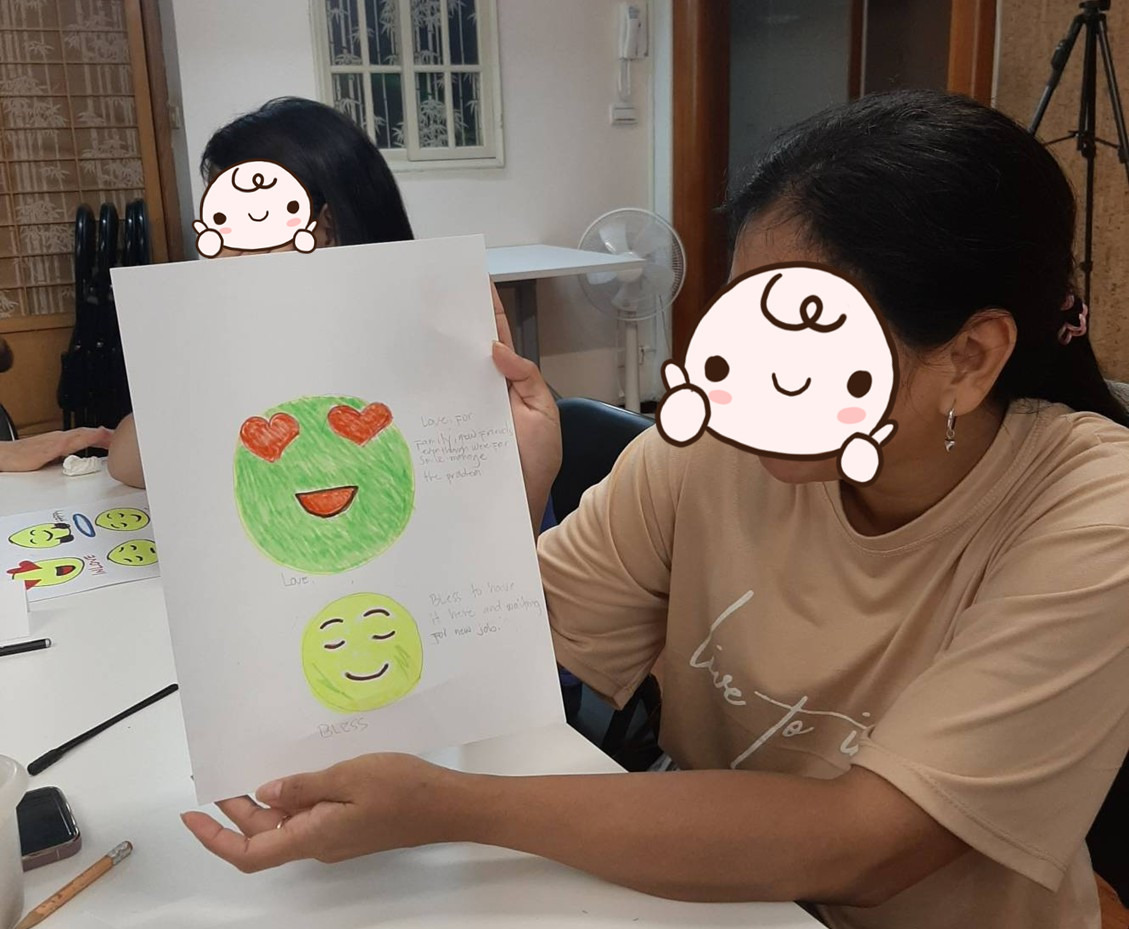 介紹心理健康後,我們進行了“最近感覺怎麼樣?”的活動。在這個活動中,移工會在紙上畫畫Emoji,來表達他們最近的情感。每個人可以畫出多個Emoji,然後分享他們的感受。在這個活動中,大家都非常認真地畫畫,並熱情地分享了他們最近的感受。每個人都畫了兩個以上的Emoji,有些人感到快樂,有些人感到難過,還有人正喜愛上這個活動。