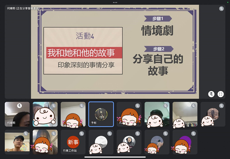 今日的活動主題是「生活中的人際-我們之間的故事」,主軸聚焦在自我情緒覺察與行為認知覺察與改善,希望青少年們能夠在與人交流時,掌握自己的情緒。帶領活動的老師與孩子們是第一次在雲端上見面,為了讓彼此更加熟悉,特別準備了破冰遊戲來認識彼此。幸運的是,即使素未謀面,孩子們在課堂中依然表現得十分熱情且禮貌,並且很快進入團體狀況中。