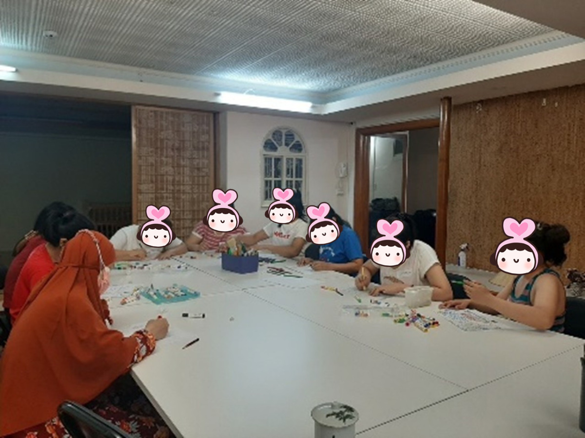 新事特別為外籍移工辦理「自我成長」團體課程,首先是透過繪畫分享的方式,協助移工自我認識、自我了解。課程由屋樹人測驗啟動繪畫模式,移工們紛紛表示好久沒畫圖了或不會畫圖,在帶領者的引導下大家提筆作畫。過程中發現大家一開始都先選擇用鉛筆構圖,最後才開始使用彩色筆或色鉛筆著色,每個人都十分謹慎仔細和想要把作品畫好的態度和氛圍。圖畫完成後,大家進行分享並由移工的畫作中協助分析其自我特質,增進其自我了解。更由圖畫中回憶自己的家鄉與家庭成員,讓彼此更進一步相互認識。