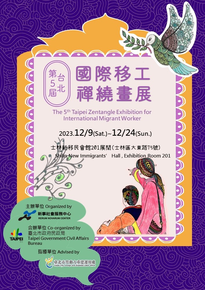 第五屆台北國際移工禪繞畫展已於112/9/10在大安森林公園捷運站展出,以「 走入移工世界:故鄉‧新家鄉」為主題,透過作品的展示與互動活動,向民眾展示印尼、菲律賓及越南文化,當日約有350位民眾參觀欣賞並希望能擴大展出,新事中心將在12月的聖誕氛圍下與臺北市政府民政局一起合辦,再次將此次禪繞畫作品於台北市士林新移民會館再度展出,開幕當天將由印尼及菲律賓移工表演自己國家的傳統舞蹈及歌曲,歡迎大家親臨現場欣賞移工們用心的創作,走入移工的內心世界,讓我們與移工的距離更近一步,不再只是彼此的陌生人。