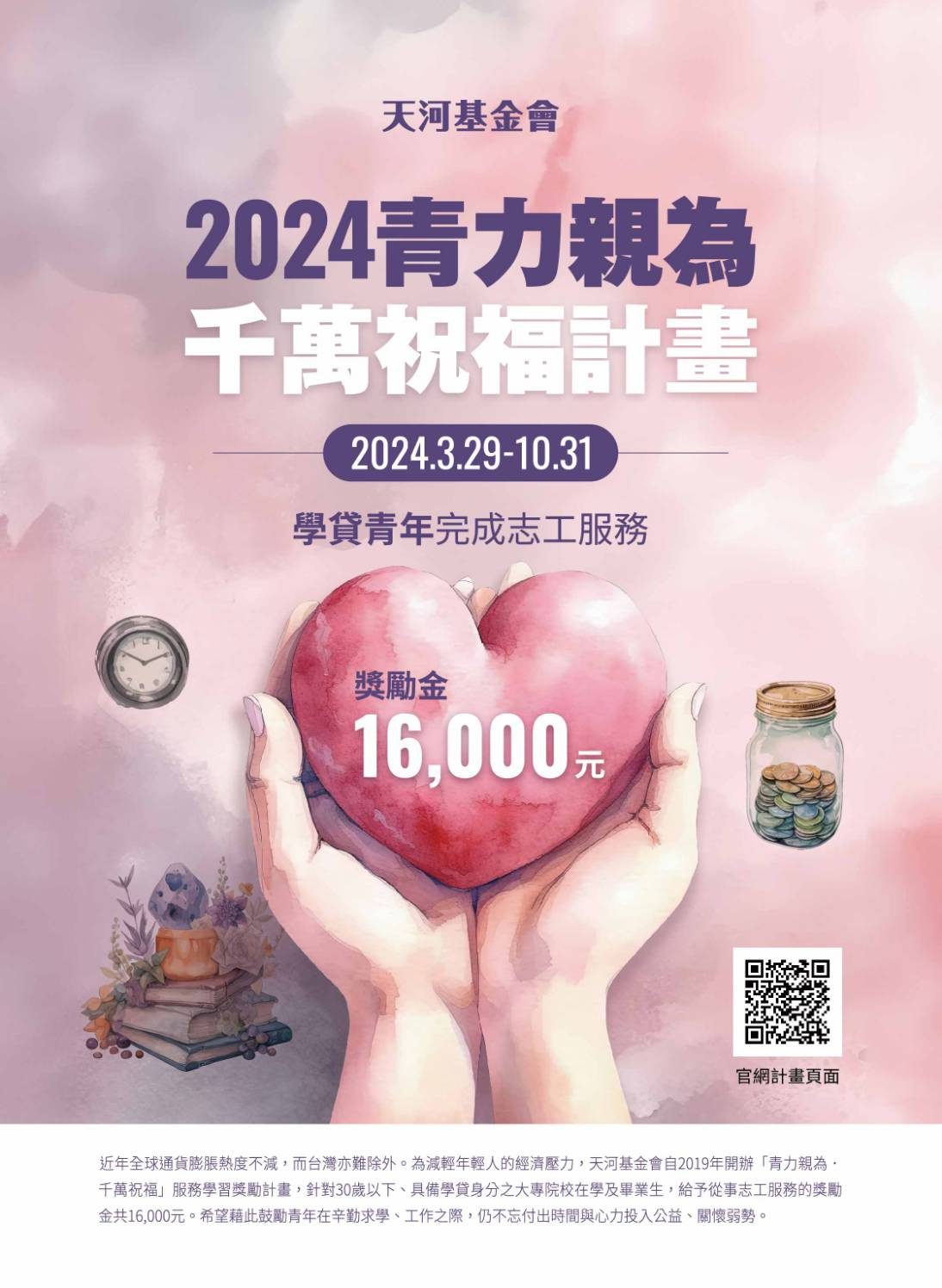 年輕人辛苦了!天河基金會「青力親為.千萬祝福」計畫,提供每人16,000元獎勵金,幫助青年還學貸,鼓勵30歲以下的年輕族群當志工、做公益,實現自我,助人亦助己!