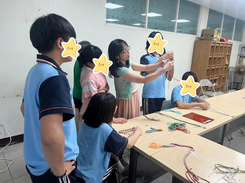 學生聽完老師的說明,接著就去台前拿取自己喜歡的配色,並跟著老師的步驟去製作吊帶,在製作中每個孩子都非常認真,為了製作出漂亮的吊帶,課程中積極向老師提問,老師也非常開心這些孩子們很積極學習。