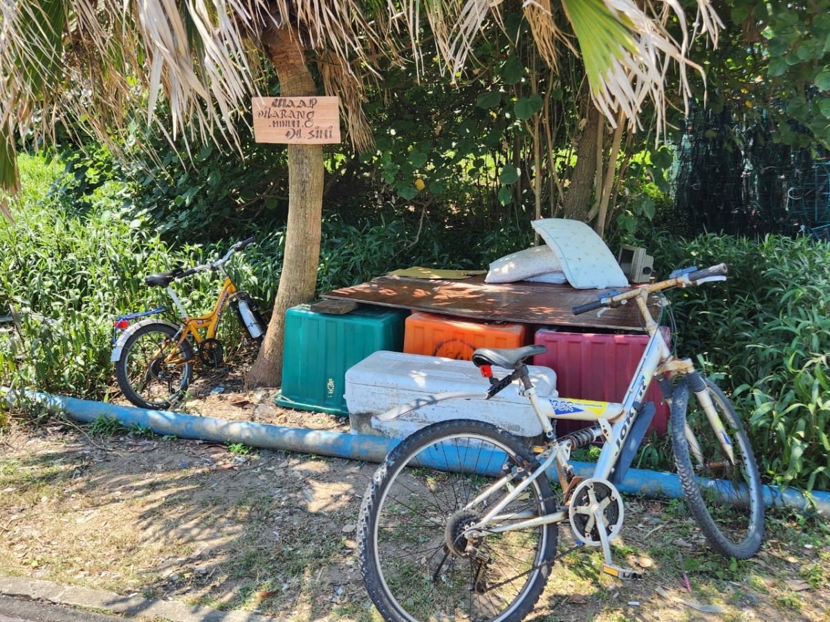 漁工在港邊睡午覺的地方,是由木板和方形水桶疊起來的床。樹上的牌子寫著:不要在這裡喝酒。