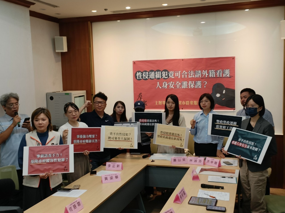 日前基隆市發生移工被雇主暴力對待,並且監禁、性侵長達九個月的駭人事件,桃園市群眾服務協會聯合新事社會服務中心與NGO團體、立法委員洪申翰、林淑芬,於2號在立法院研究大樓召開記者會,向勞動部控訴,主責看護工工作訪視的基隆市政府社會處訪查不力,縱容性侵犯施暴移工,甚至意圖吃案。