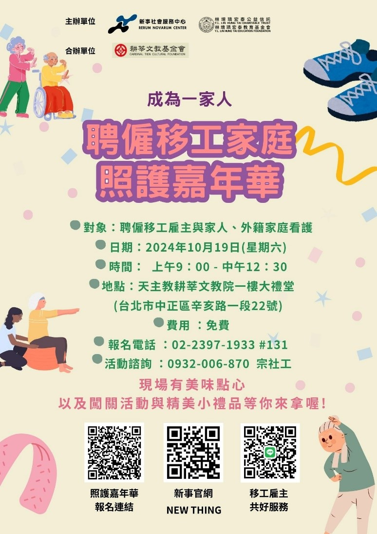 新事社會服務中心將10/19(週六)在天主教耕莘文教院舉辦移工雇主共好社區活動「聘僱移工家庭-照護嘉年華」,誠摯邀請您與家人以及聘僱的外籍家庭看護工一起來運動!