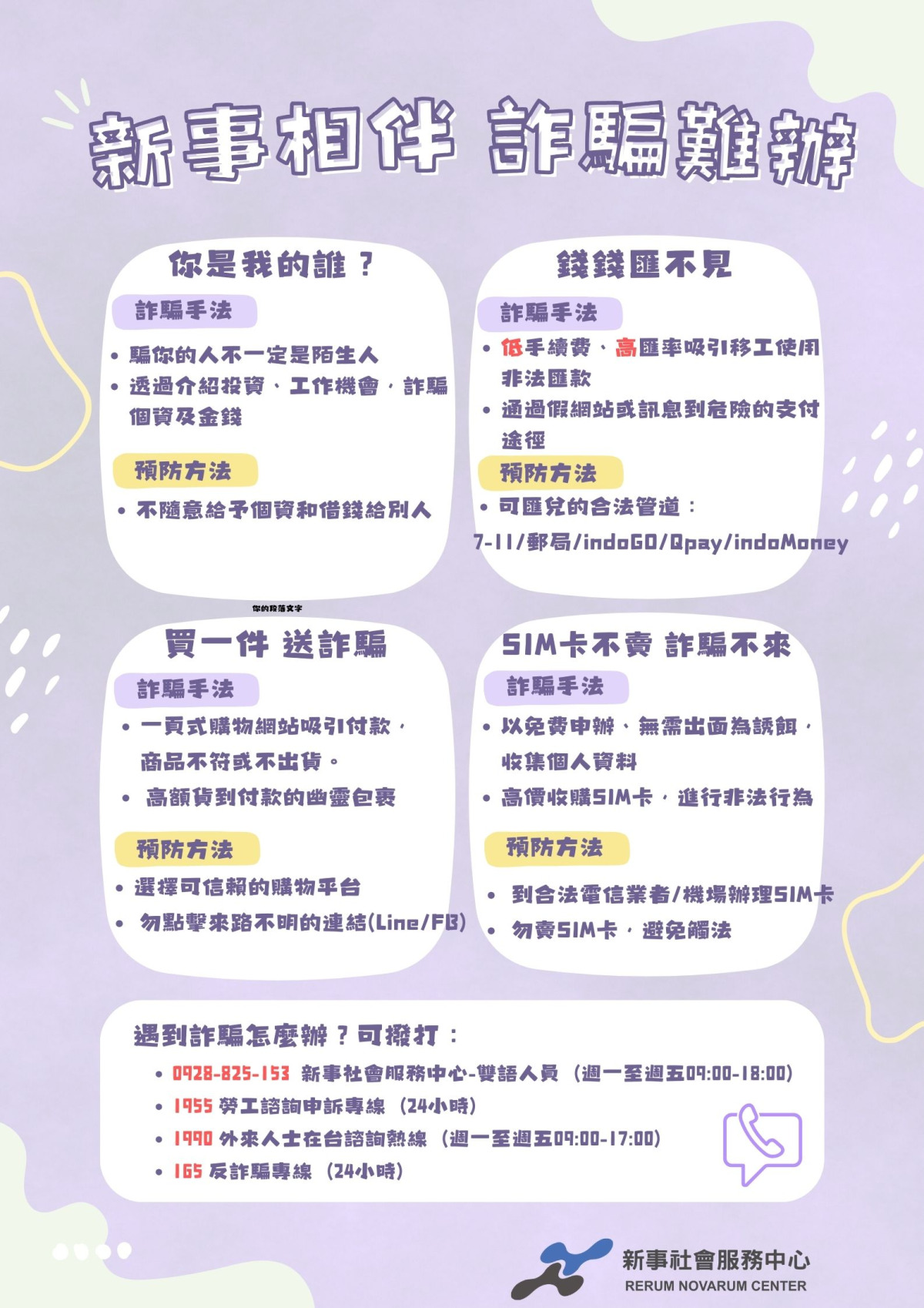 新事社會服務中心希望能透過這些資訊提升外籍移工與新住民社群對詐騙的警覺性。我們新事提供雙語防詐宣導活動,傳遞防範知識,並提供可靠的求助管道,例如反詐騙專線165、移民署1990多語服務熱線,幫助大家有效防範詐騙。