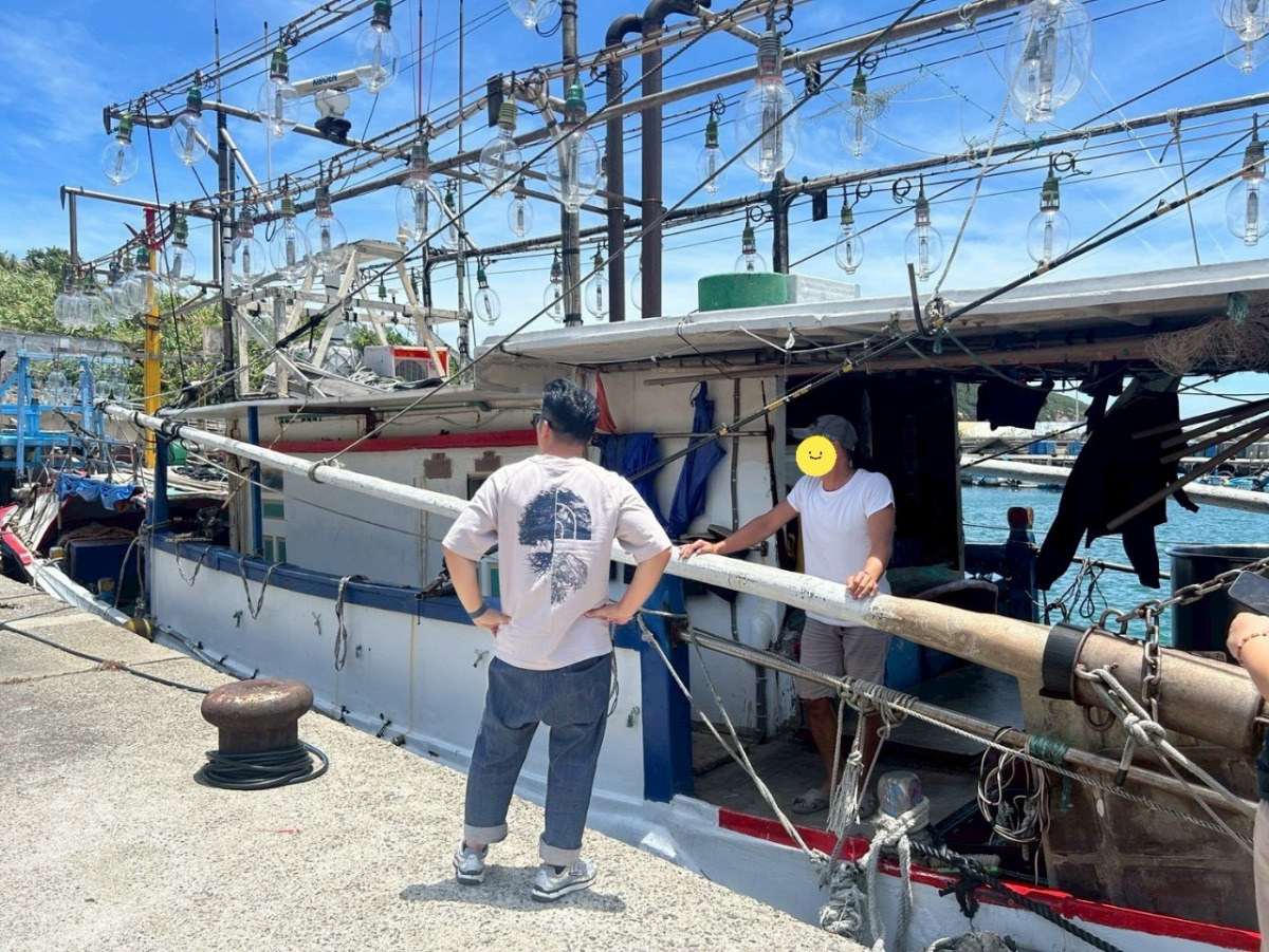 當我們抵達東澳漁港,唯一一艘有人的漁船上,有位漁工正在與遠在另一端的家人視訊話家常,隻身來到異國他鄉打拼的漁工,與家人、朋友的聯繫成了他們休息時間重要的時刻。漁船靠岸的時間除了會在漁船上,許多漁工也會在漁港邊的空地聚集,幾個沙發、一張桌子、一個棚子,就成為他們休閒放鬆的空間,以及臨時的祈禱室。