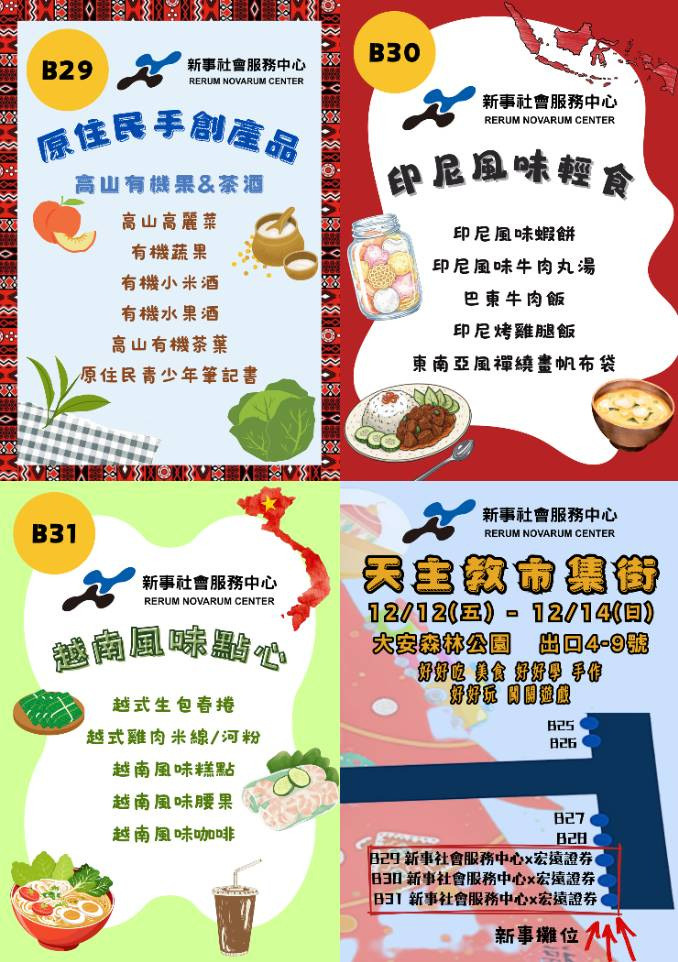 攤位市集義賣,攤位包括原住民有機自種蔬果、茶葉、小米酒,以及越南生春捲等料理、印尼牛肉丸湯、蝦餅等。