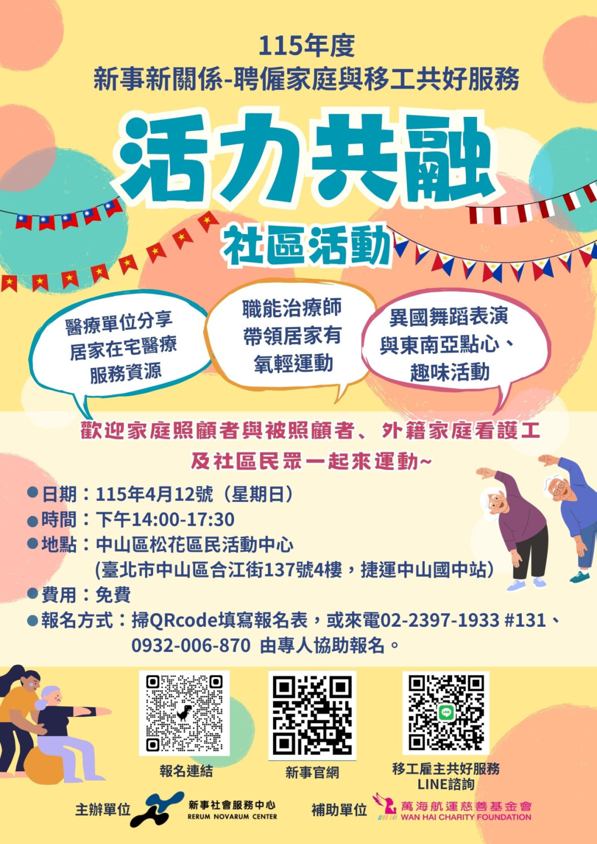 新事社會服務中心 誠摯邀請雇主家庭與移工夥伴一起走出家門,來到中山區參加這場專為大家設計的「活力共融」活動!