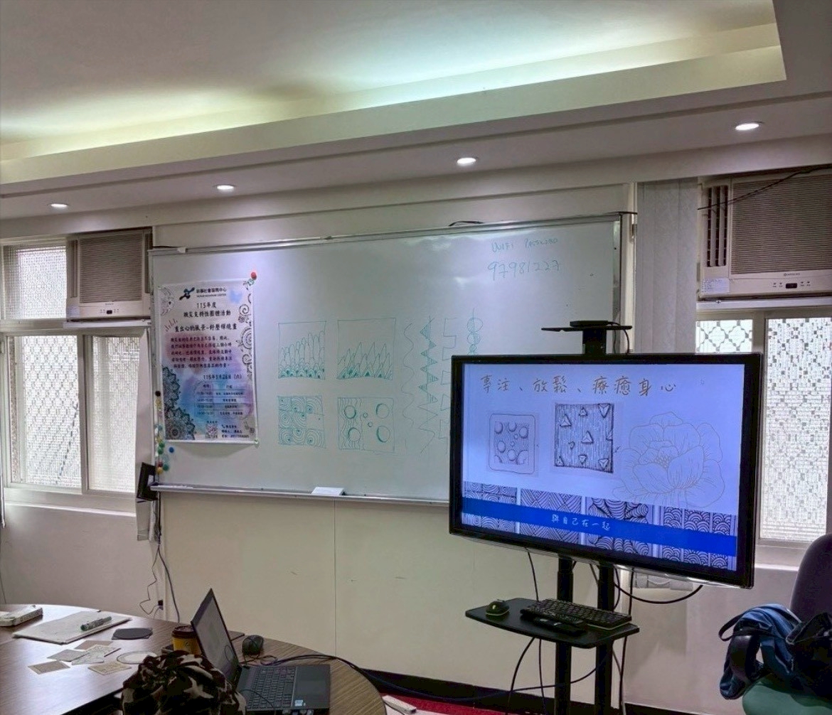 王老師簡單地介紹禪繞畫後,參與者便開始展開創作體驗。在教室裡,參與者們圍坐在一起,在老師的引導下,大家慢慢地沉浸在自己的禪繞畫創作中。現場除了老師指導的聲音外,只剩下畫筆劃過紙張的沙沙聲,讓原本浮躁的氣氛,隨著活動的進行,轉化為溫柔而專注的能量。這不僅是一次的藝術創作,更是一次集體的身心放鬆。