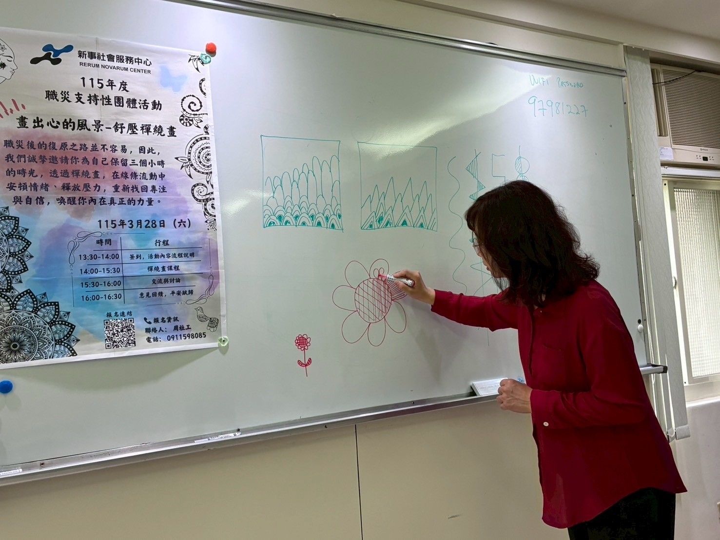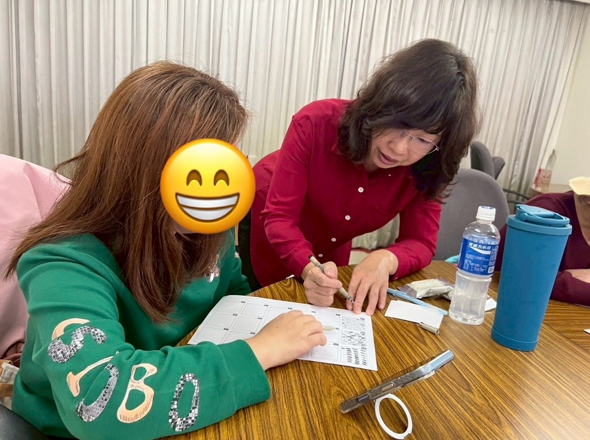 在活動進行中,老師也隨時留意每位參與者的狀況。上圖可看見王老師正耐心地一對一指導學員,協助參與者克服對線條的不確定感。新事社工也發現許多職災朋友在老師的鼓勵下,從最初對「畫錯」的恐懼,轉變為樂於嘗試新的圖案。