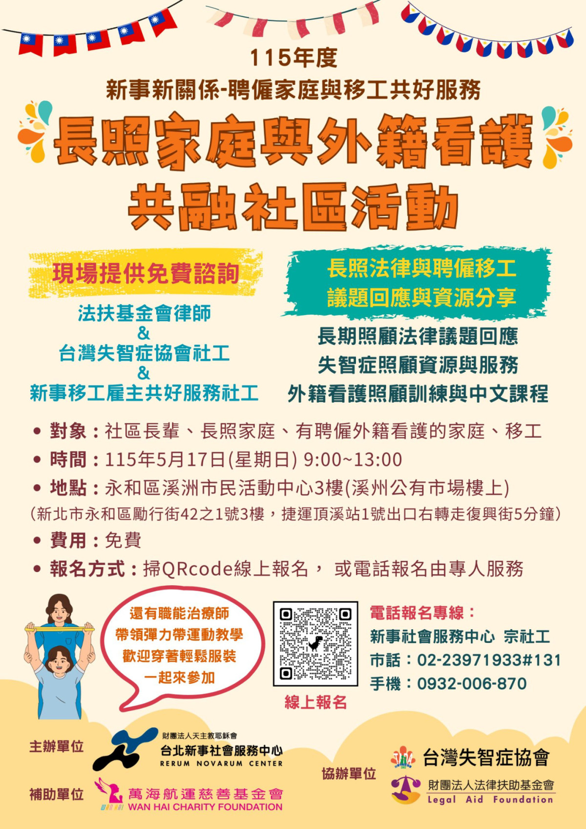在長照的路上,您並不孤單。為了支持聘僱外籍看護的家庭,並促進社區長輩與移工朋友的交流,新事社會服務中心將於 5月17日(週日) 舉辦一場充滿活力與實用資訊的社區共融活動。