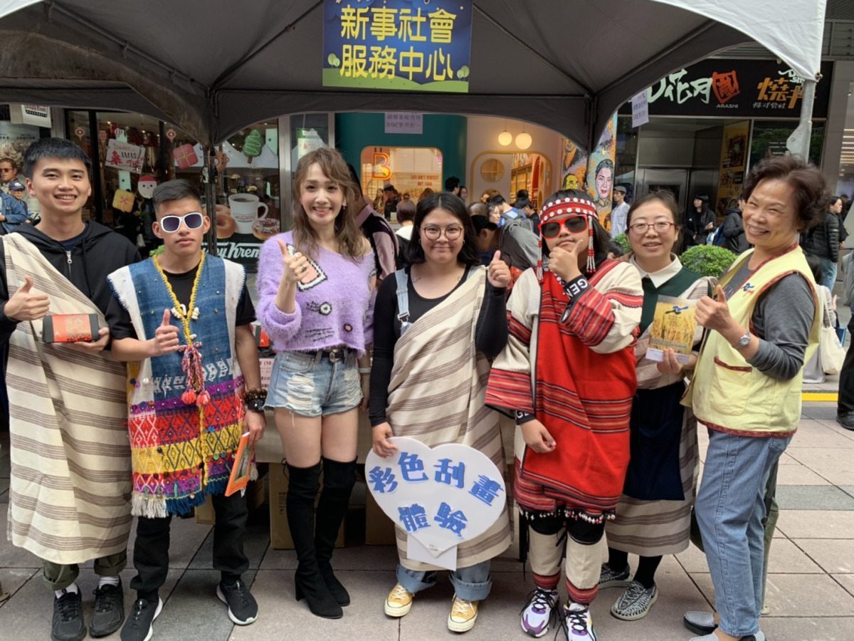 新事的專員及竹東工作站的社工員和兩位原住民青少年一起協助新事的義賣攤位活動。這次義賣的主要商品是原住民種植的阿朗茶,由烏龍茶、紅茶以及純原片三種品項構成,此外,也展出了竹東課輔班原住民青少年創作的作品集;另一方面,社工也準備了彩色刮畫,讓與會的大朋友、小朋友都能體會繪畫的樂趣。