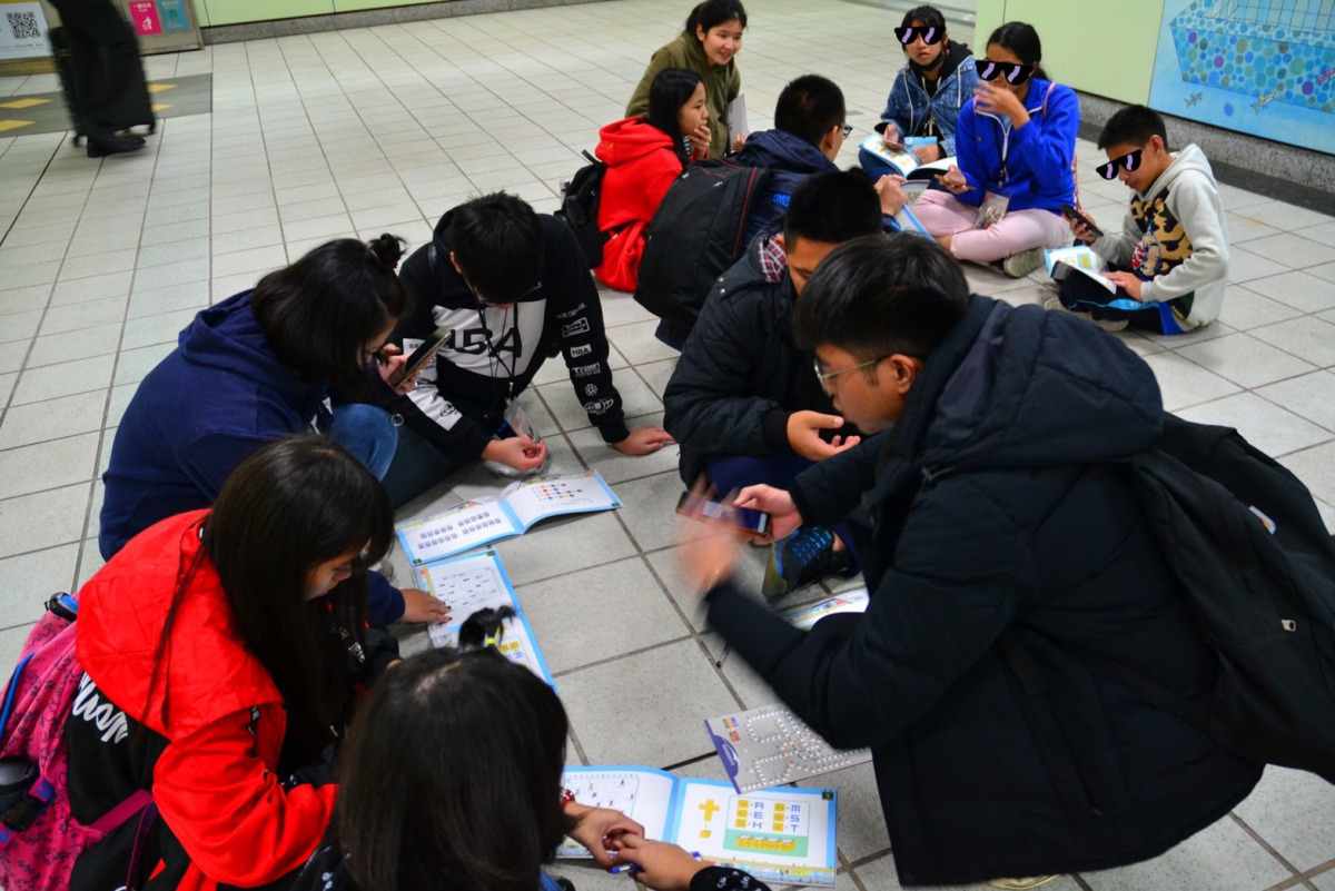 參與網路視訊教學課程的青少年在輔大與自己的視訊老師見面,老師從螢幕走到現實生活中陪在自己身邊一起參與闖關活動,感受著不同的學習氛圍與交流。