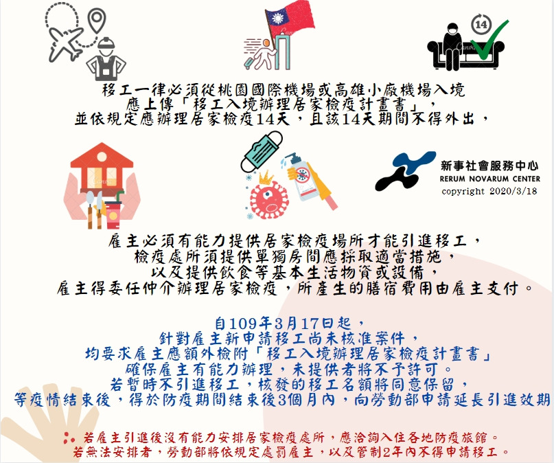 隨著新冠肺炎疫情全球的快速擴散,勞動部也對於聘僱國際移工的家庭、雇主及工廠公布更嚴謹的防疫相關措施,除了認真進行手部清潔、環境消毒及配戴口罩之外,有關入境移工和建議暫緩返國休假的最新措施,新事社會服務中心快速的整理各項重點,請雇主注意配合辦理相關事項喔: