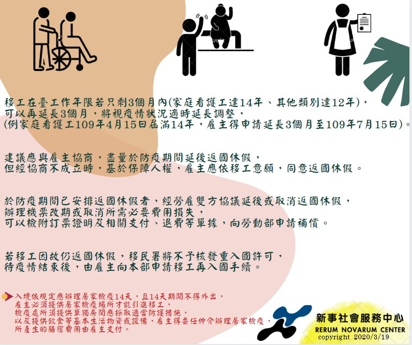 隨著新型冠狀病毒全球大流行,大部分的國家都進行了嚴格的入境管制,目前外國人士除了持有居留證外一律禁止入境,對於在台工作的移工來說,若之前休假返國再持有居留證返回台灣工作時,需強制進行居家檢疫14天,雇主需要提供居家檢疫的場所,但移工方面也有許多要注意的事項,新事社會服務中心特別將重點整理製作成多國語言版本,歡迎雇主及仲介轉載分享,但別忘了註明出處喔~