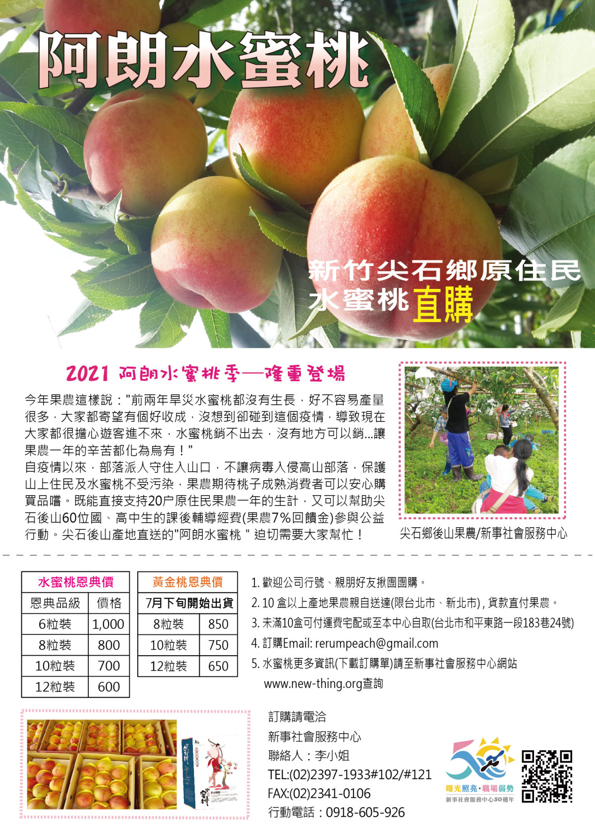 新事社會服務中心推動【尖石鄉阿朗水蜜桃直購活動】邁入第十七年,與新竹尖石鄉20戶原住民果農共同合作、協助產地直銷新鮮的水蜜桃,果農們發揮部落互助精神,回饋水蜜桃利潤的7%贊助部落下一代年輕子弟的「原住民國高中生課後照顧計畫」。誠摯的邀請您廣為宣傳、揪團預購、共襄盛舉。