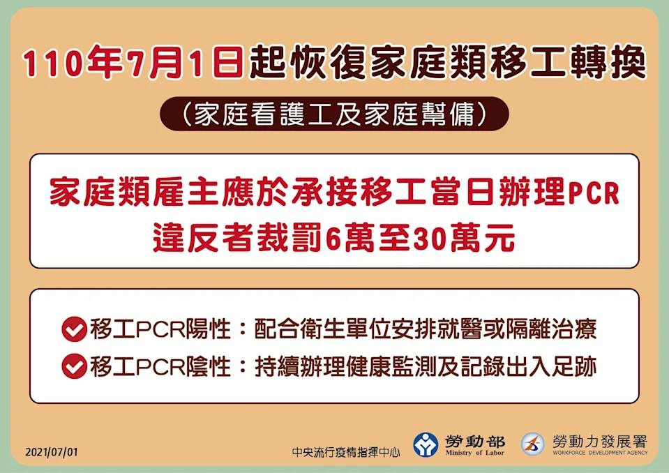 7/1起恢復家庭類移工轉換雇主,新雇主應於接續聘僱當日安排移工檢驗PCR,且應負擔PCR檢測費用!