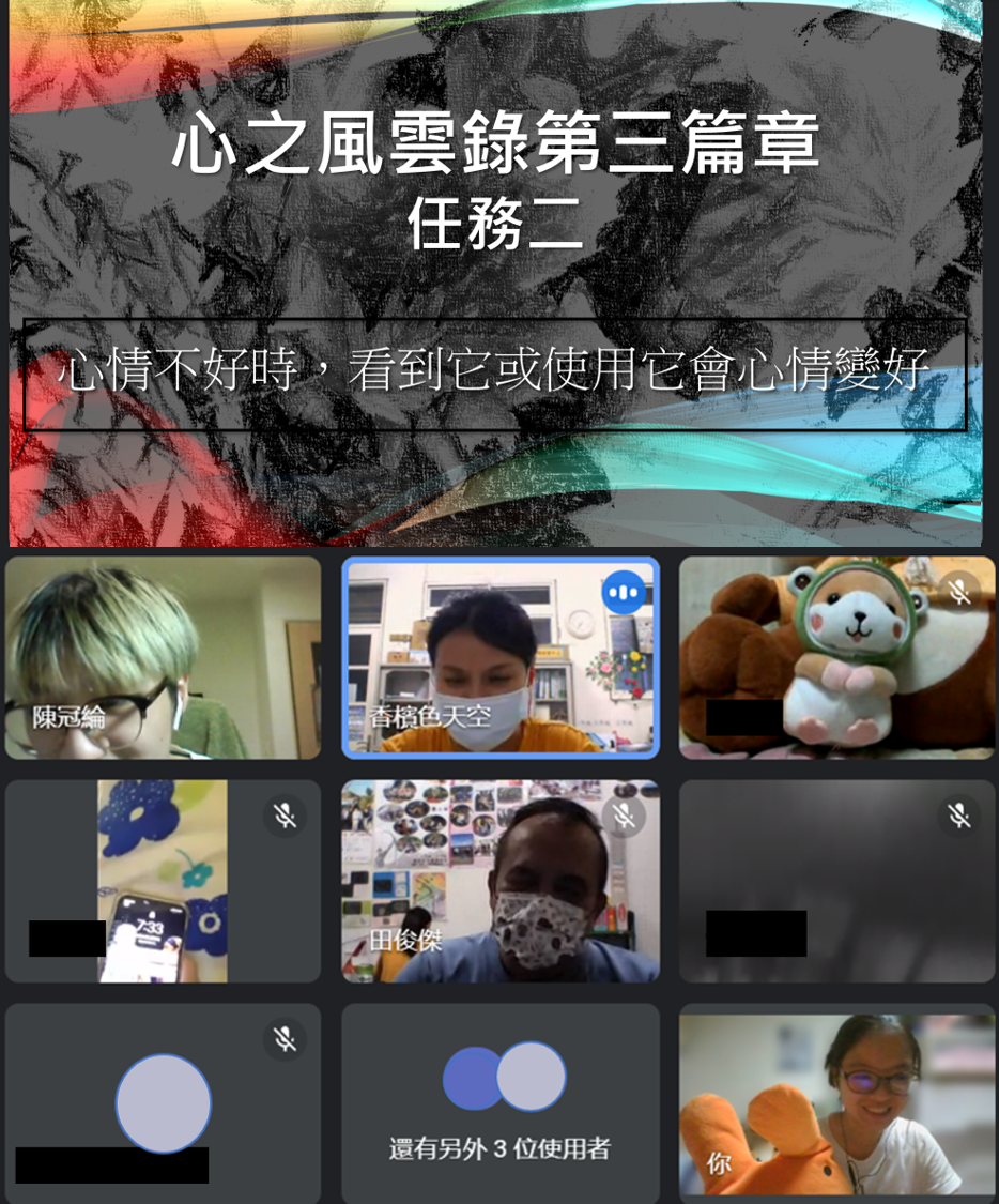 由於疫情的關係,每周在線上相聚,相隔螢幕帶領的團體並不容易,也需要更多的引導技巧和注意隱私問題,但帶領者也用心透過遊戲、戲劇對話、心理測驗、畫畫等活動、分享與討論等多元形式切入,由淺入深,期待成員們在當中能有快樂且有所學習的經驗。目前團體已經進行四次,在互動分享上也越來越熱絡,而從成員的回饋裡也可以看見他們在「不同情境中管理自我情緒而有適當應對」、「怎麼解決事情」、「知道降低壓力方式」上的成長,成員間的發言互動與彼此鼓勵也隨著我們「心之風雲錄」的旅程持續著。期許未來成員們更能在認識、管理、控制以及抒發情緒有所成長,做自己情緒的主人翁,並能在與他人溝通上,減少誤解也建立關係。