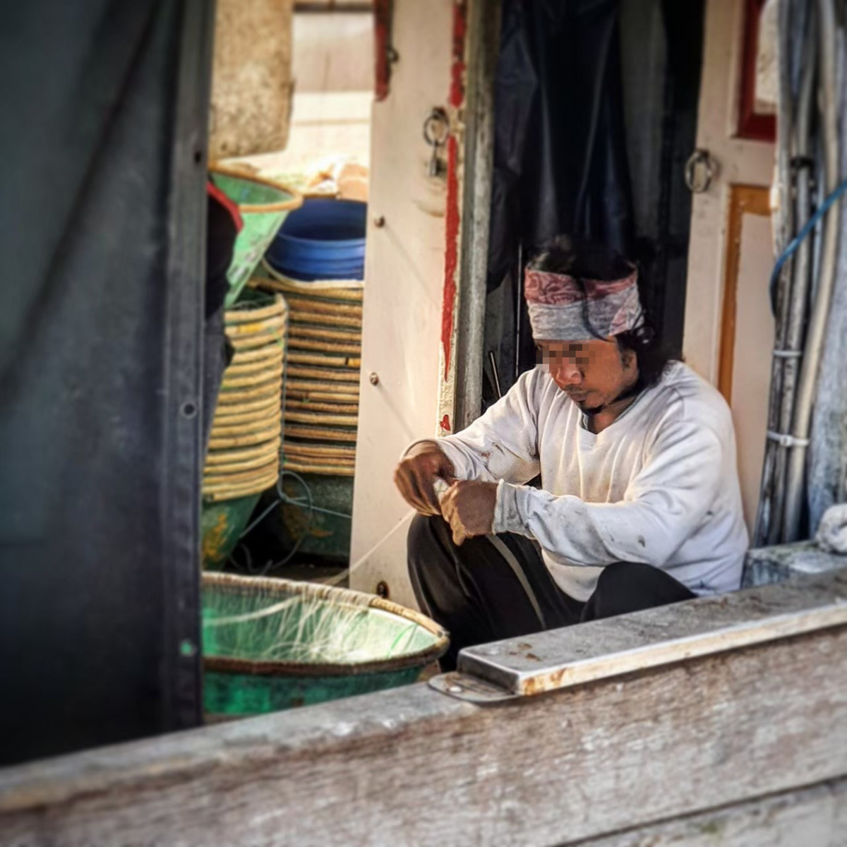 此時望向海邊停靠的漁船上,看見幾位漁工打著赤膊,蹲坐在搖晃的船艙中,看似低著頭滑著手機享受一個悠閒的午後,但是仔細觀察,手中拿的並不是手機,而是纖細且強韌無比的魚線,他們那雙已長滿繭的雙手正在縫上魚鉤,再往旁邊一睹已經累積了好幾十籃了,每一籃都整齊堆滿了釣線。這樣的畫面,對於我平常想像中討海人的生活,在眼前的此刻也同時被打破,他們不只是在出港後與大自然對抗,承受著風浪,努力的捲起漁網,將這些收穫帶回岸上,經過了千千萬萬張雙手,最後成為了你我的晚餐。