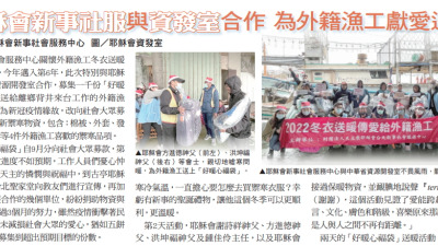 - 新事社會服務中心關懷外籍漁工冬衣送暖活動,今年邁入第6年,這次特別與耶穌會中華省資源開發室合作,募集一千份「好暖心福袋」,送給離鄉背井來台工作的外籍漁工。